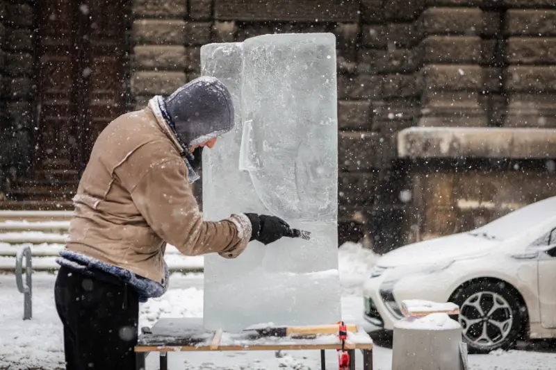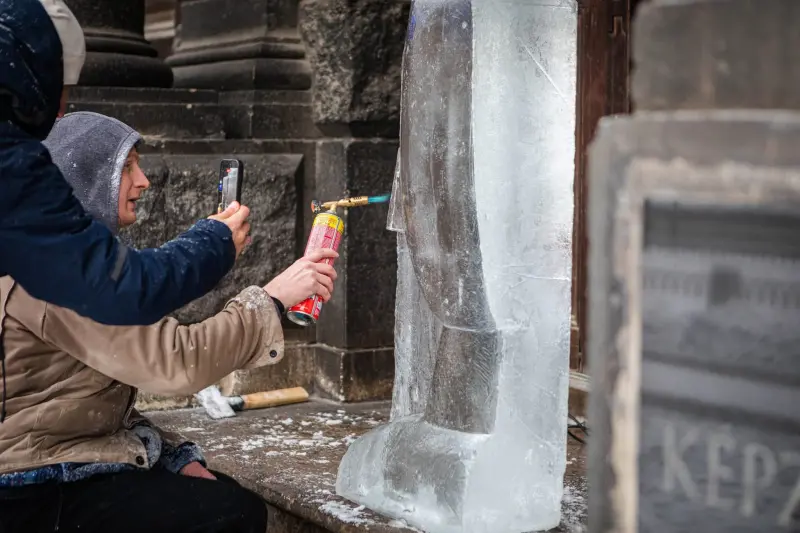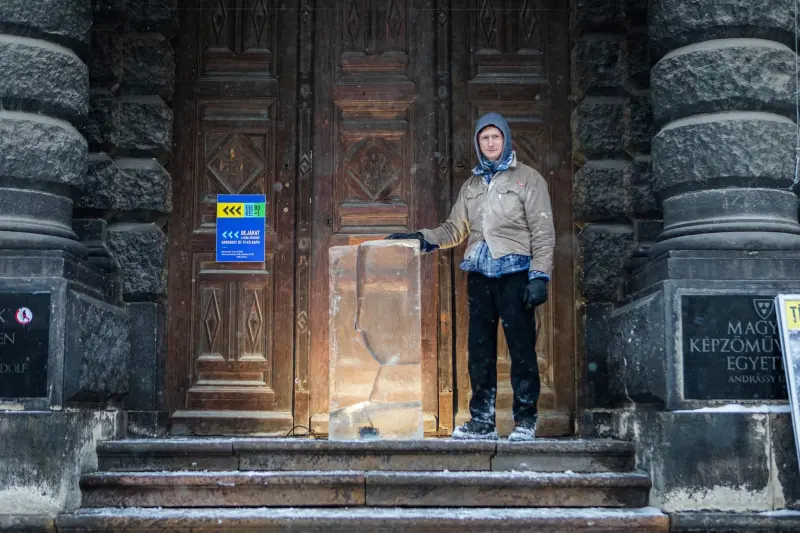 120 kilós jégtömbből készült szobor várja a látogatókat a Magyar Képzőművészeti Egyetem bejáratánál