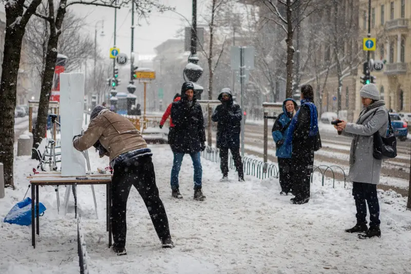 Nem mindennapi látvány fogadta az Andrássy út 69. szám alatt sétálókat péntek délután: Wessel Martin, az MKE hallgatója erős havazásban és mínusz négy fokban dolgozott órákon át a szabad ég alatt.