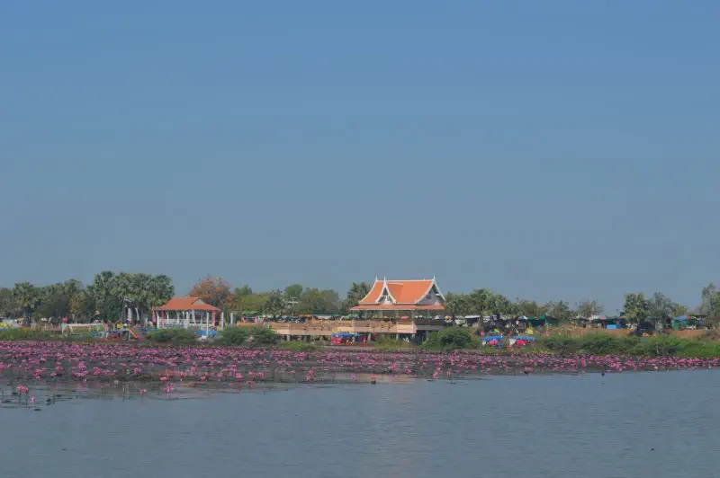 A Vörös Lótuszok Tengere viszont minden csak nem kiábrándító. Bár- valljuk meg – első látásra nem gondolnánk, hogy valami nagy durranás következik. Udonthaniból bekesebb, mint egy óra alatt érünk ki a tó partjára. Mindenképpen reggel – a lótuszok (hogy valójában azok-e, arról később) reggel virágoznak. Az igazi hardcore utazók napkeltére ide szeretnek érni – ami biztos hozzáad az élményhez, de akkor hajnali öt körül kellene indulni Udonthaniból, azt meg mi azért nem akartuk. Átlagos thai vidéki tájon haladunlk át, és egy nem különösebben látványos parkolóban hagyjuk a kocsinkat.