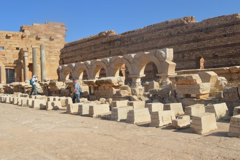 Az első építmény, amit meglátunk már helyből a Severus dinasztiához kapcsolódik – Septimius Severus diadalíve. Akkor építették, amikor a város nagy szülötte immár császárként 205-ben hazatért. Akárcsak a város nagy részét ezt is az olasz gyarmati időszakban tárták fel, hozták rendbe. Idegenvezetőnk még mutogatott is képet, amint Mussolini magát cézárnak képzelve díszeleg előtte.
