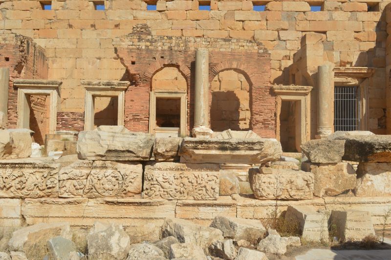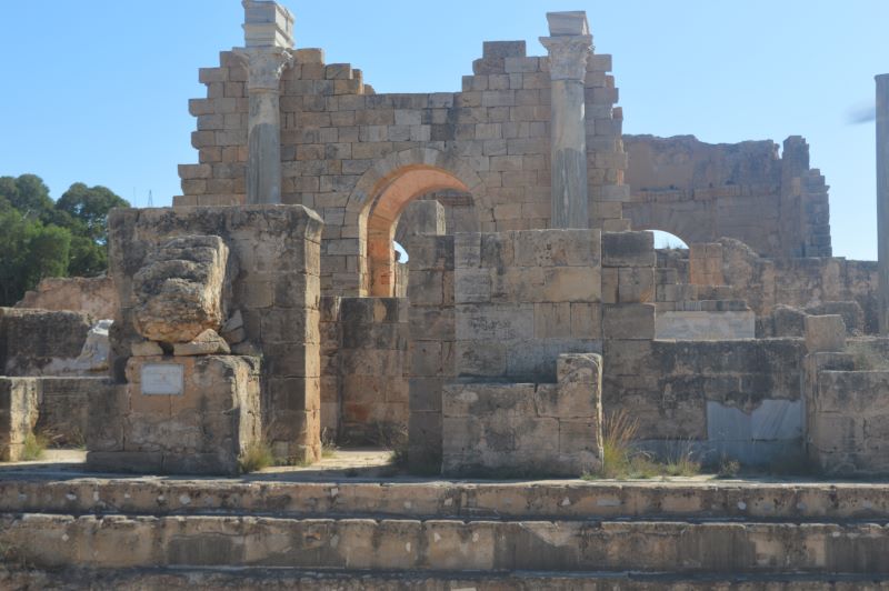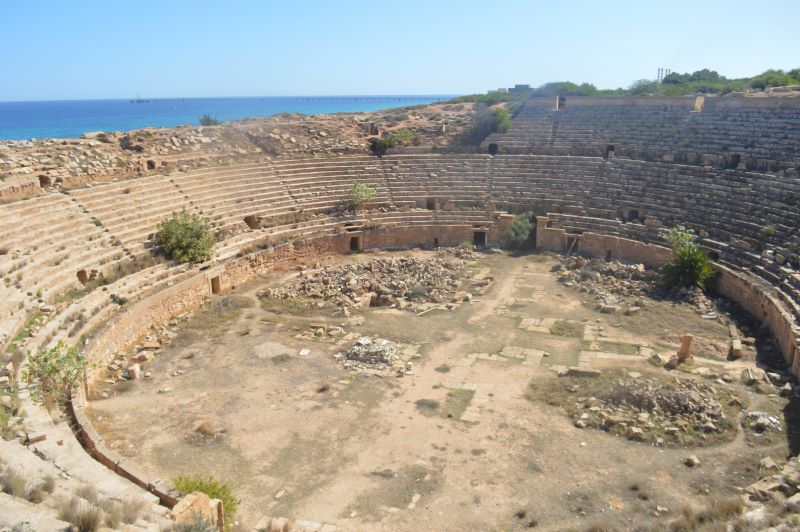 (Ma ebből már gyakorlatilag semmi nincs – olajfa még van egy kevés, de az éghajlat szárazabb lett,, a halszószt már nem esszük, a transz-szaharai kereskedelemből pedig csak az embercsempészet maradt – amikor ott jártunk, akkor is fogott egy migránshajót a líbiai haditengerészet, a szintén római romjairól híres Sabratha mellett innen indul a legtöbb csempészhajó. ) A várost az ókor végén elhagyták – sosem települt újra – így ma is szinte teljes pompájában áll. A tengerparton áll az egykori színház, nem messze tőle a kikötő. Szerencsésebb sorsú országokban az ilyen színházakban ma fesztiválokat rendeznek – Líbiában ide még nem jutott a turizmus.