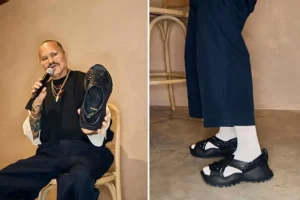 Az Abodi Mini Castle táskával kombinálta megjelenést. Ez a forma már ismerősnek lehet. Jaden Smith a 2025-ös Grammy-gálán viselt Vámpírkastély fejdísze nagyon hasonló volt. Ezek a kiegészítők az Abodira jellemző szobrászati gondolkodásmódot idézik: a tervező a divatot, egyszerre tárgynak és mitikus építészetnek látja.