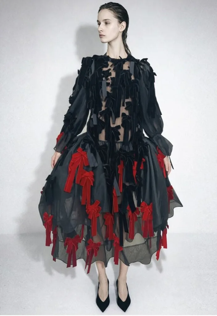 A szalagokkal rétegezett, áttetsző fekete ruha, melyet piros-fekete masnicsoportok díszítenek, nemcsak gyönyörű. Ha jobban megnézzük, van benne valami kissé nyugtalanító. Ez a ruha több, mint dekoratív.